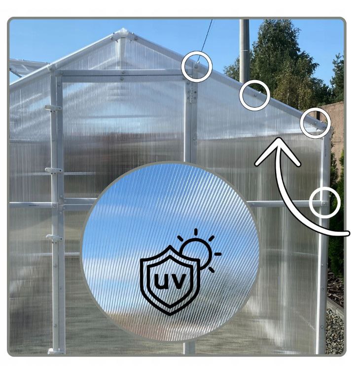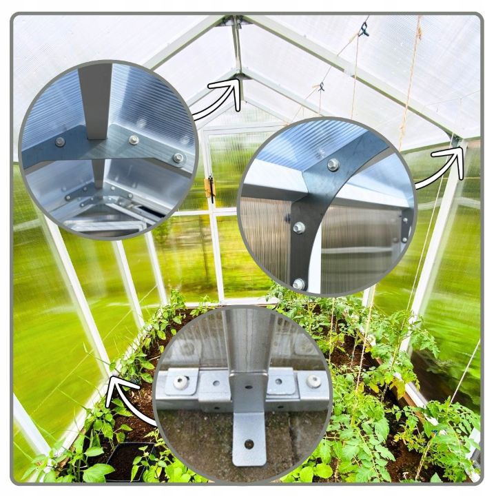 Łączenie – to nie tylko wytrzymałe szybkozłączki, które po skręceniu nadają stabilności szklarni ale i zastosowanie dodatkowych wzmocnień w ilości aż 15 sztuk. Wzmocnienia mocowane w szczycie dachu oraz w miejscu łączenia ściany dachowej oraz bocznej są wykonane z blachy ocynkowanej 2mm.