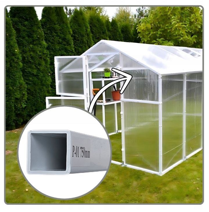 Profil PCV zamknięty 30x30mm o grubości ścianki 1,5mm  oraz profil stalowy zamknięty 30x30mm o grubości ścianki 1mm– to dzięki profilom zamkniętym oraz zastosowaniu odpowiedniej grubości ścianki szklarnia zyskuje swoją odporność na niekorzystne warunki atmosferyczne takie jak śnieg czy wiatr.