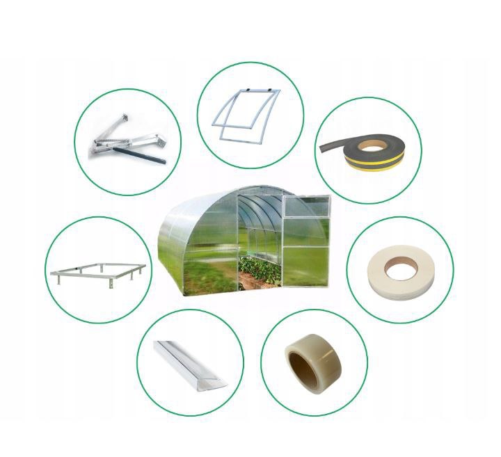 Wszystkie elementy niezbędne do montażu są w zestawie. Śruby do mocowania szkieletu szklarni, wkręty specjalne z gumową uszczelką EPDM do montażu poliwęglanu i kotwy do wzmocnienia szklarni na ziemi.